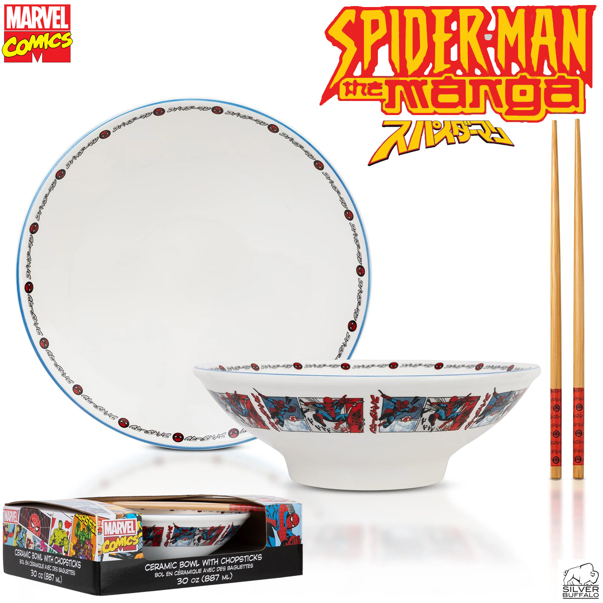 A tigela Spider-Man Manga Panels 30-Ounce Ramen Bowl and Chopstick Set custa US$25,99 na Toynk Toys.