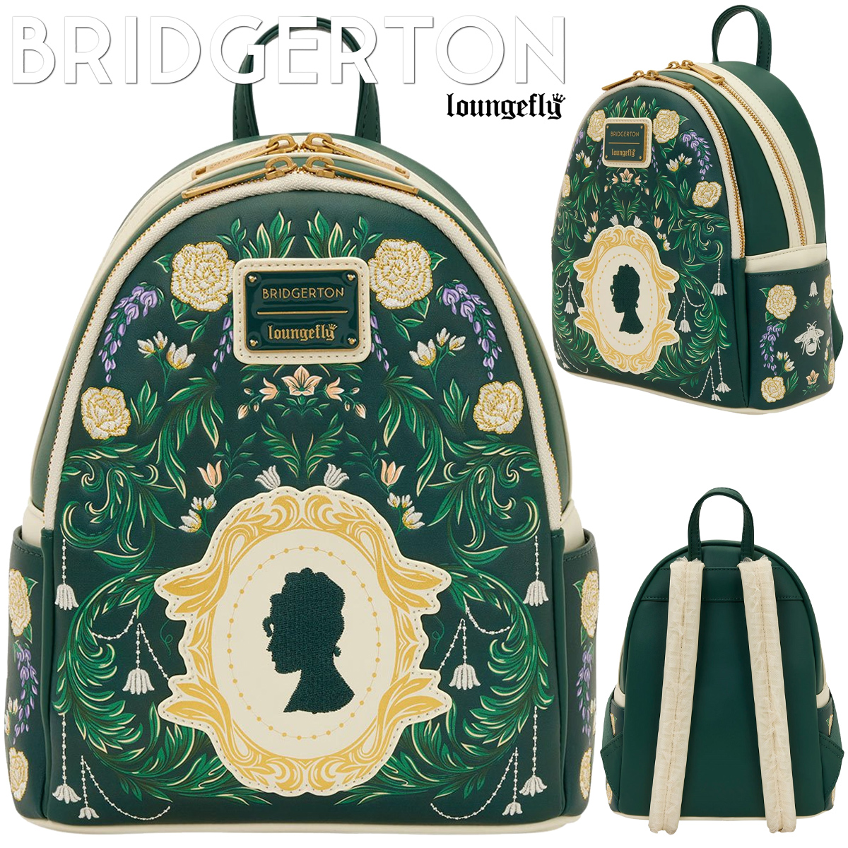 The Bridgerton Silhouette Floral Mini Backpack features beautiful floral prints across the front and side pockets with gold foil, embossed and embroidered details on a dark green background. In the center it has a feminine silhouette framed by an ornate golden frame and the straps have a tulle finish that adds an elegant touch.