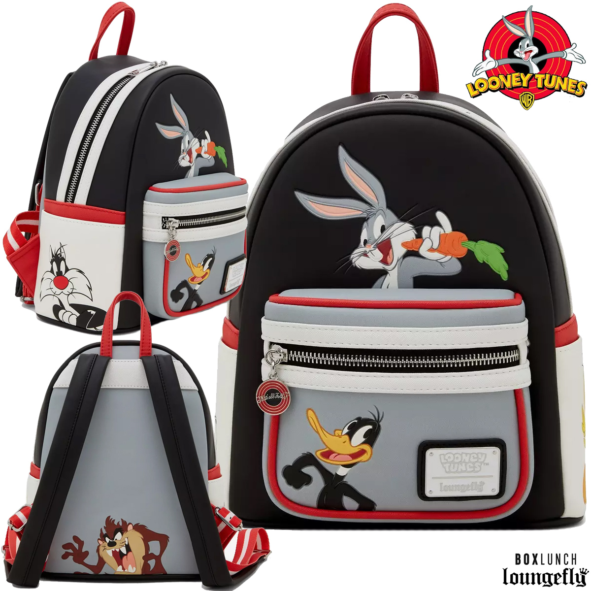 The Looney Tunes Characters Color Block Mini Backpack – BoxLunch Exclusive has a black background, gray front pocket with red border and white side pockets, as well as the main characters from the animated series in relief, including Bugs Bunny, Daffy Duck, Frajola and the Tasmanian devil (Taz). The zipper comes with a “charm” pendant in the shape of the famous “That’s All Folks!” logo.