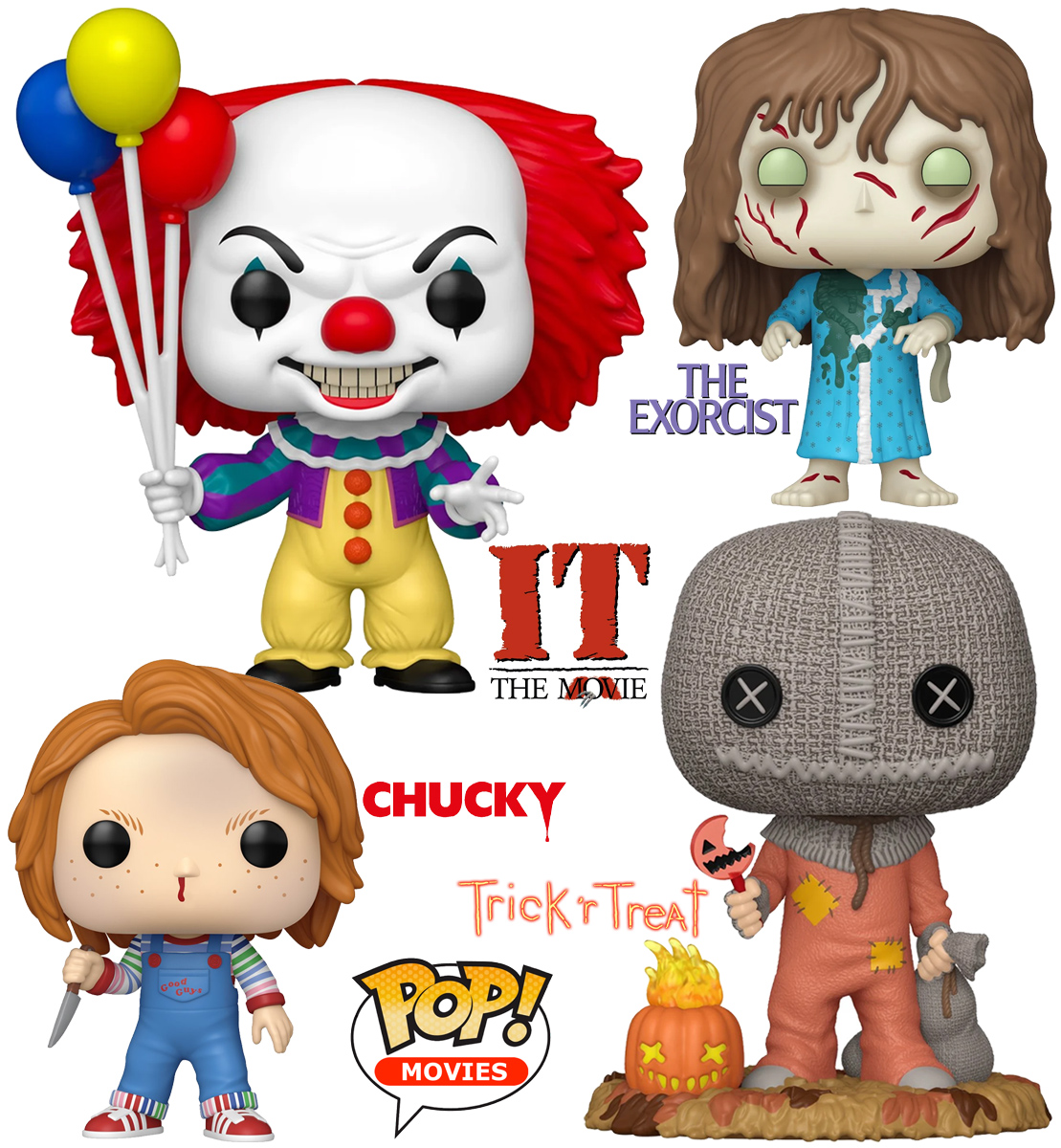 The Dancing Clown Pennywise (1990) IT The Movie Pop! Vinyl Figure (#1834) with a classic look from the miniseries IT – A Masterpiece of Fear (11.4 cm); the killer toy Chucky (Bloody Nose) Child’s Play Pop! Vinyl Figure (#1957) with knife and bloody nose (10.2 cm); the creature Sam with Pumpkin Trick r Treat (2008) Funko Pop! Vinyl Figure #1956 with diorama base from the film Tales of Halloween (9.9 cm) and the girl Regan The Exorcist Pop! Vinyl Figure (#1967) with blue shirt at the height of possession (9.4 cm).