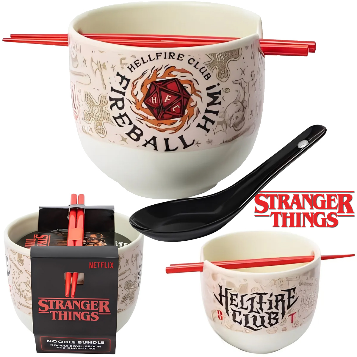 The Stranger Things Fireball Club Tazón Ramen bowl has a white background decorated with illustrations in monochromatic lines of symbols from the series, D20 dice in red on fire and logos of the RPG group “Hellfire Club”, led by Eddie Munson at Hawkins High School, in addition to the expression: “Fireball Him!” used by Mike and Dustin to encourage the launch of the Fireball spell against Vecna, the powerful villain of the D&D campaign.